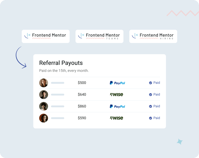 Simply share Frontend Mentor with your audience. We’ll provide resources, ongoing support, and transparent referral tracking—all you need to do is focus on creating great content.